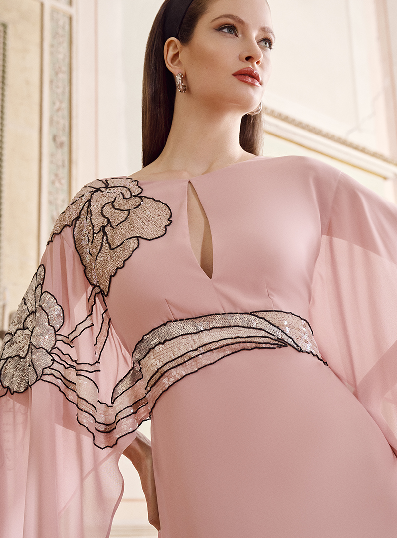 Abito lungo color cipria, dalla linea fluida ed estremamente raffinata. Il design minimal è valorizzato da un profondo scollo a fessura sul décolleté e da una manica ampia che cade morbida, creando movimento. Il punto vita è sottolineato da un ricamo floreale luminoso che si estende sulla spalla e lungo il busto, donando carattere e preziosità all’abito senza appesantirlo.