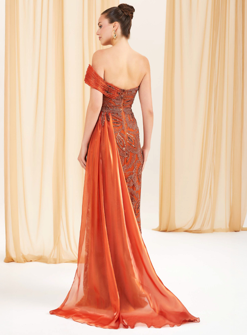 Un modello spettacolare, questo abito conquista con il suo design seducente e raffinato. Il corpino drappeggiato con scollo e spalle scoperte esalta la femminilità, mentre lo spacco laterale e lo strascico aggiungono un tocco scenografico e leggero. Il tessuto ricamato con motivi floreali dona profondità e luce al capo.