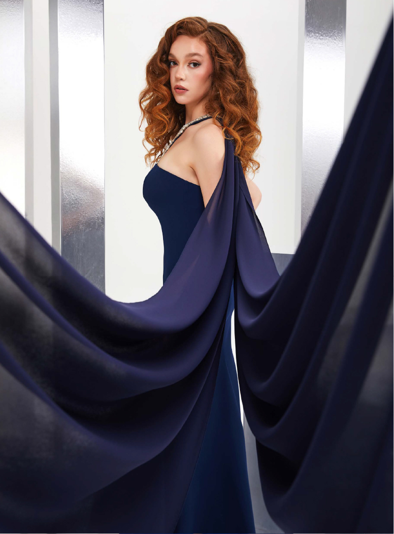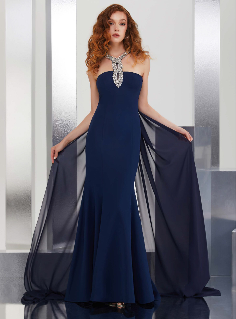 Elegantissimo abito lungo, caratterizzato da una linea a sirena che valorizza la figura. Dettagli gioiello che scendono dal collo fino al décolleté. Dalle spalle parte una stola che si apre in due fino a formare due strascichi che donano fluidità e morbidezza ai movimenti.
