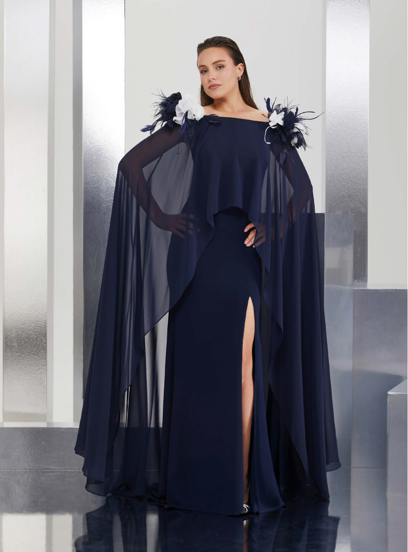 L’abito presenta una sovrapposizione fluida e morbida simile a un mantello drappeggiato con decorazioni floreali sulle spalle. La linea a sirena sotto con spacco laterale valorizza la figura.