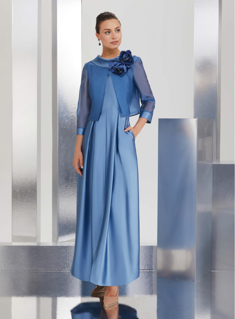 Elegante abito in raso con un top simil mantella caratterizzato da maniche a tre quarti in tessuto velato e un taglio sobrio. Il punto luce è dato dall’applicazione floreale sulla spalla. Una scelta classica per la cerimonia che dona a ogni silhouette.