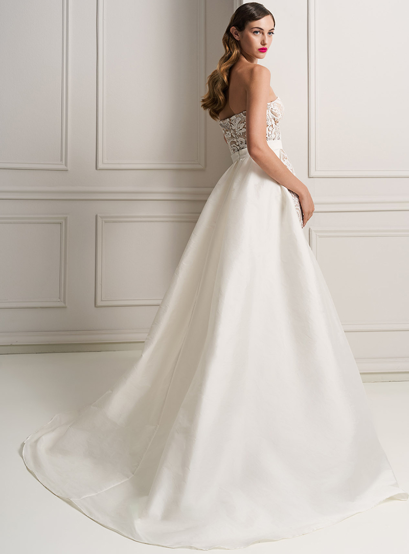 L'abito da ballo ispirato all'alta moda presenta una scollatura a cuore senza spalline ea vista con perline scintillanti sotto un busto plissettato a forma di ala su un corpetto strutturato con stecche. La gonna ampia ha tasche e uno spacco sottile sulla gonna, il tutto in tessuto Mikado radioso.