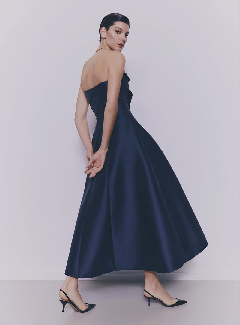 Abito da sera in raso Larissa senza spalline con dettagli a balza