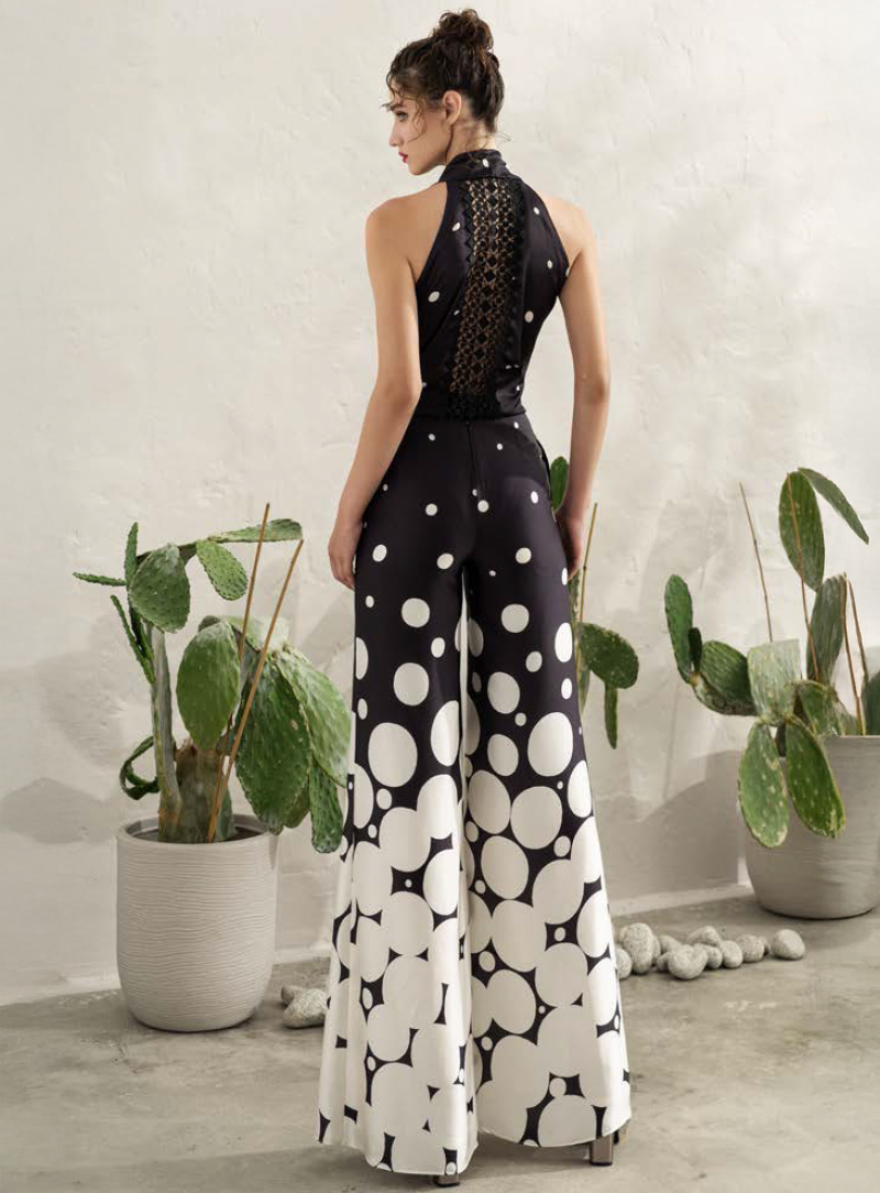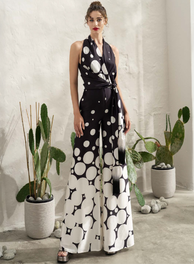 Lasciati ipnotizzare da questo look in bianco e nero che ridefinisce l’eleganza audace. La silhouette è esaltata da un corpetto minimalista e un design senza maniche. Il vero punto di forza è la stampa a cerchi degradanti, che si allarga dal busto fino a creare un effetto ottico di grande impatto. Un capo d’eccezione che unisce arte grafica e sofisticazione.