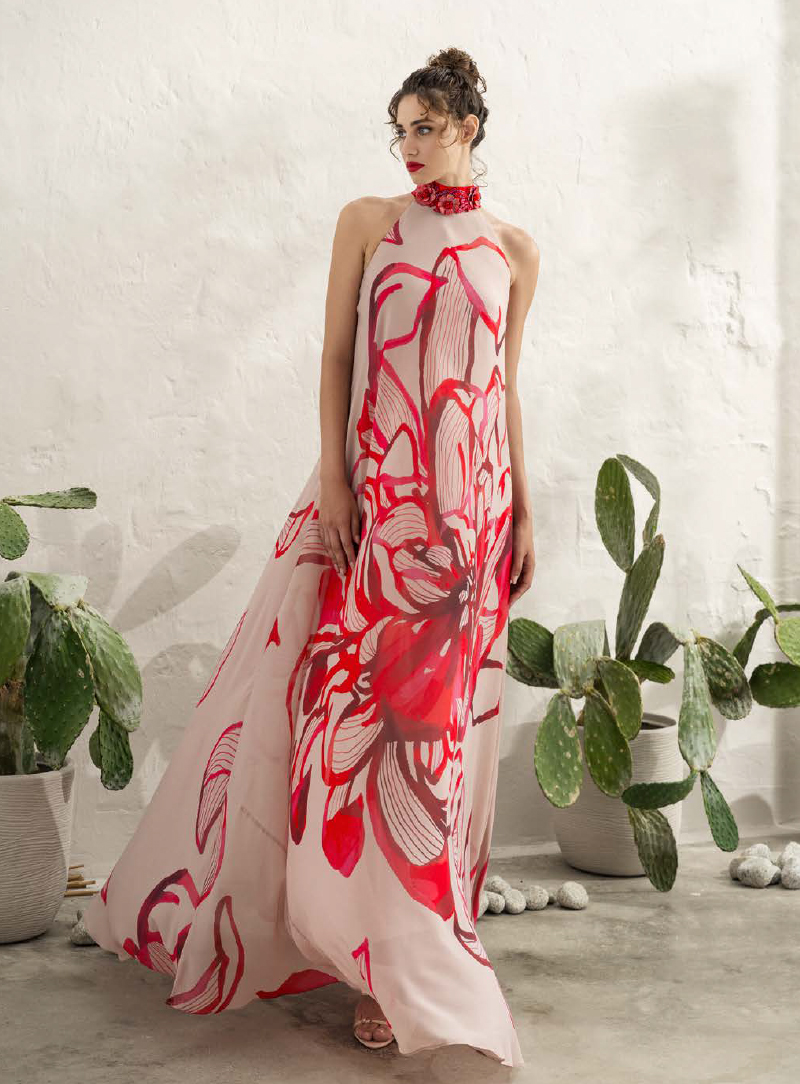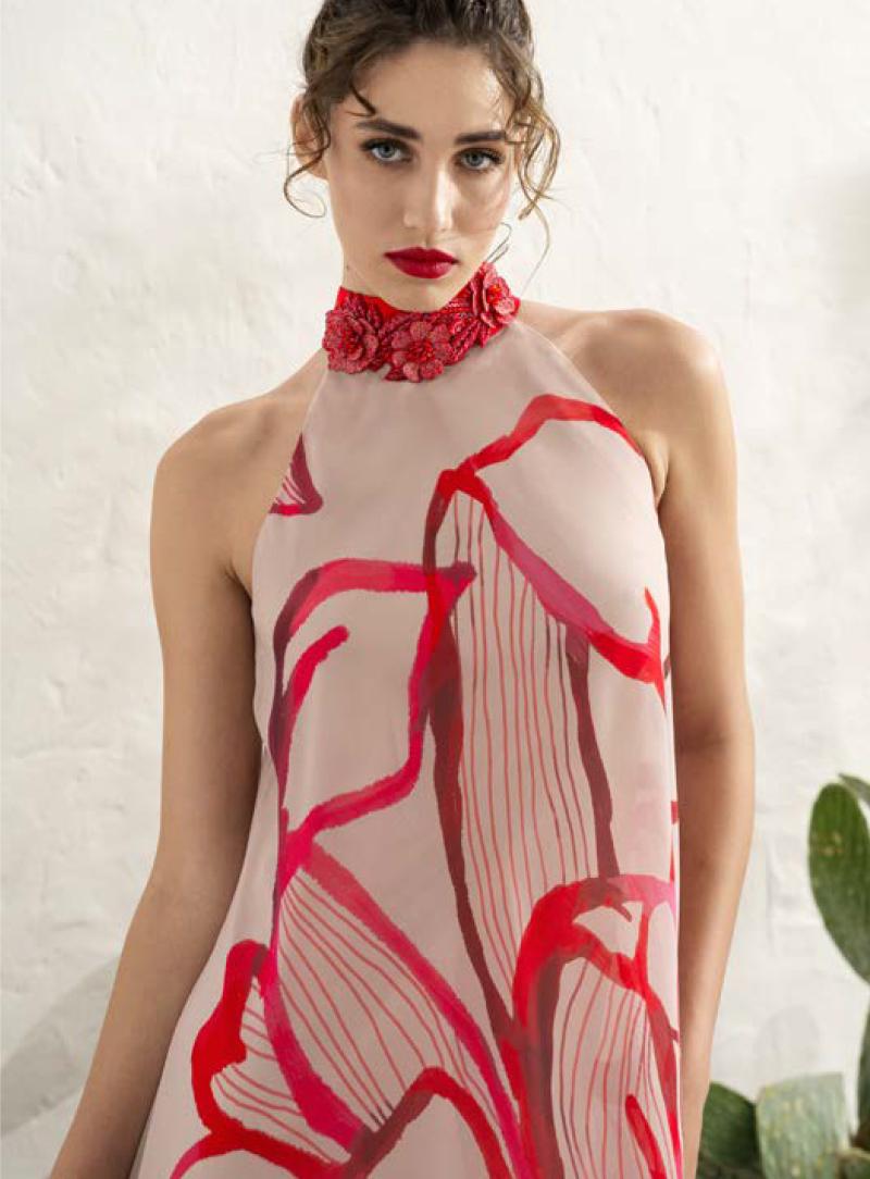 Un vero pezzo d’arte da indossare. Questo abito presenta un elegante scollo all’americana e una silhouette lunga e fluida. Il tessuto, leggero e impalpabile, è decorato con una stampa vibrante con linee sinuose. Il design posteriore aggiunge un tocco di sofisticatezza sensuale.