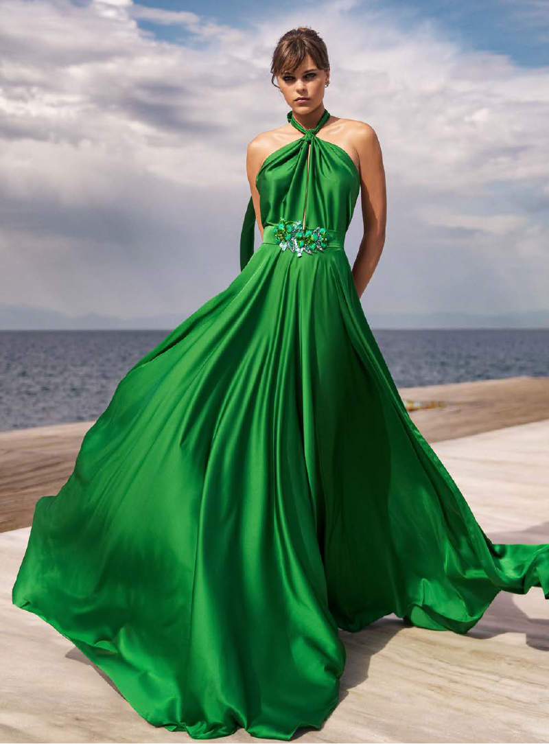 Immergiti nel lusso con questo abito da sera in una sfolgorante tonalità di verde smeraldo. Il design è definito da un elegante scollo all’americana e una schiena scoperta. Il tessuto satinato e la linea maestosa della gonna creano un effetto regale e un movimento drammatico ad ogni passo. Perfetto per un ingresso indimenticabile.