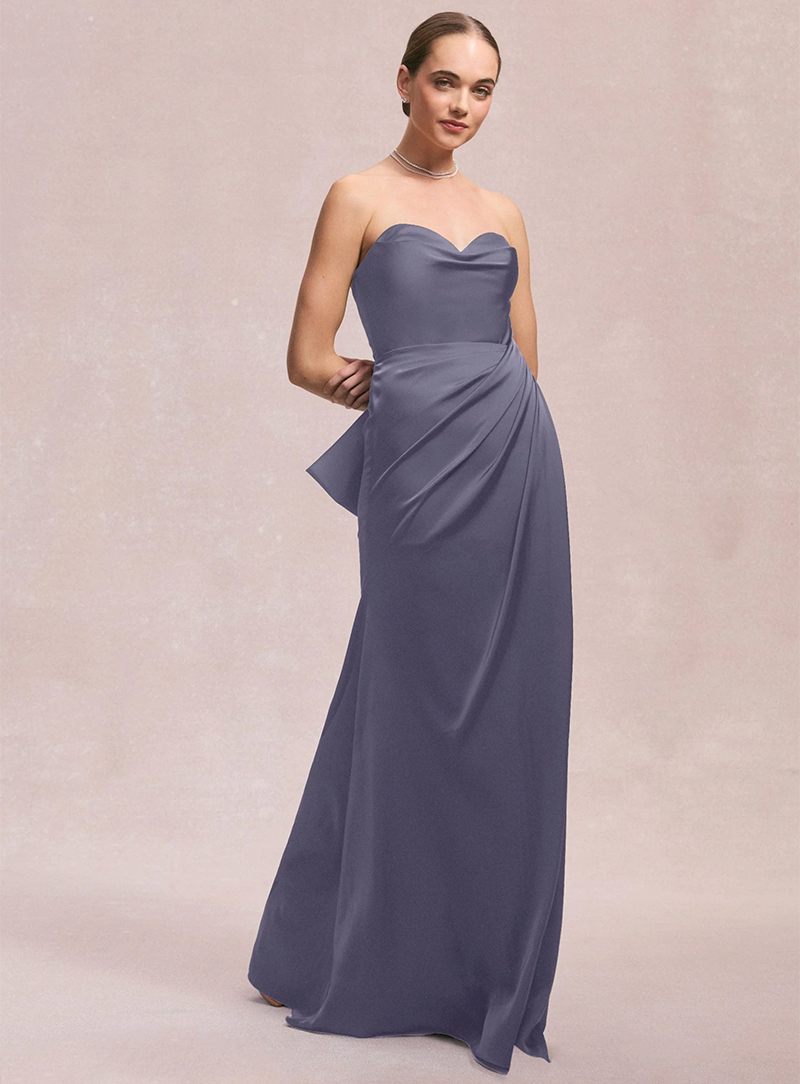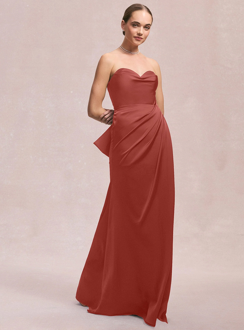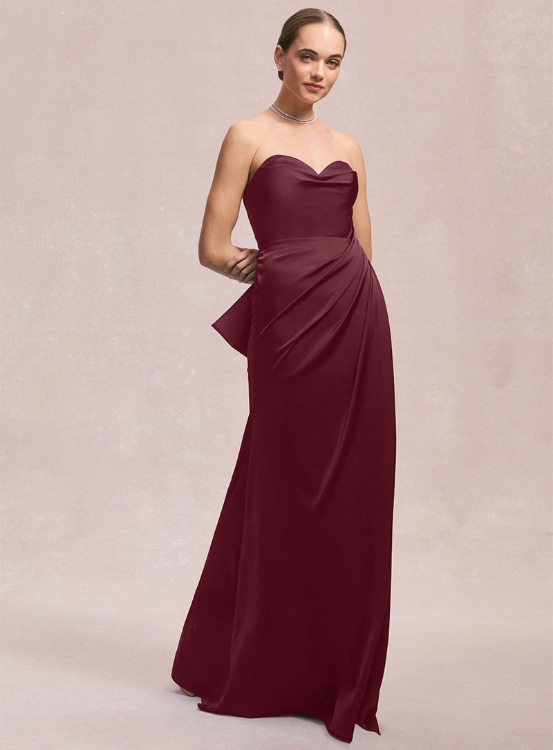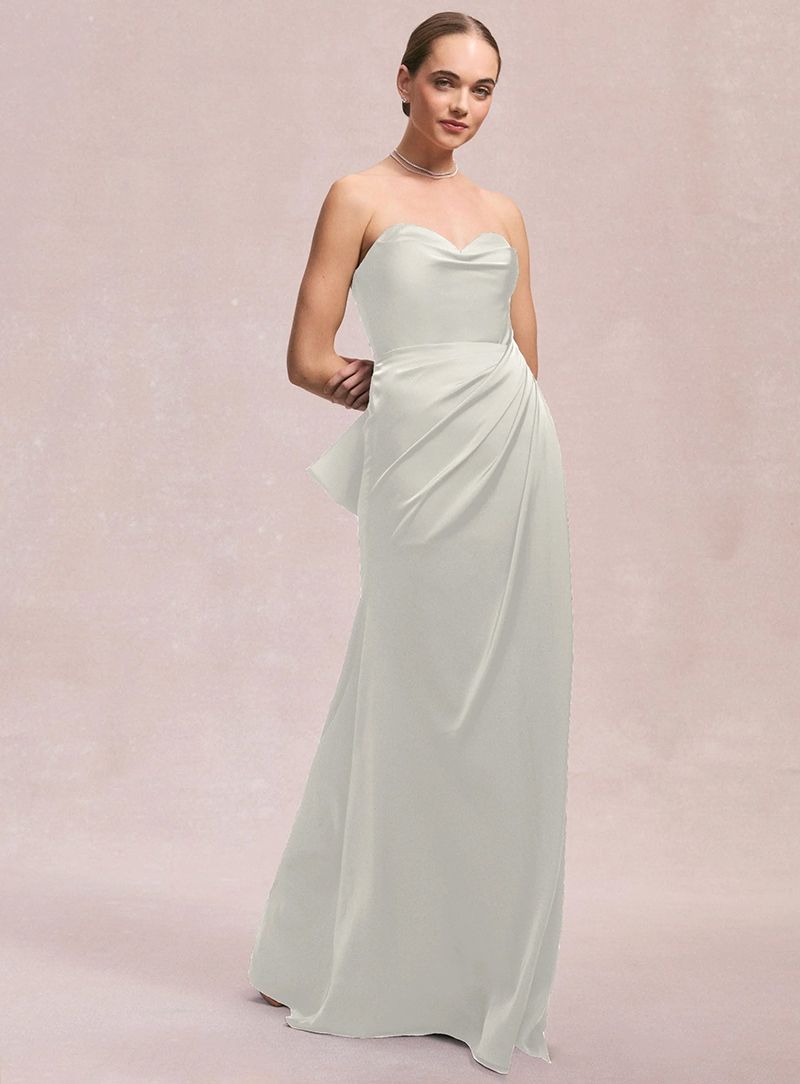 Abito lungo da cerimonia con scollo a cuore e delicato drappeggio laterale che crea un effetto scultoreo e raffinato. Realizzato in satin liscio, avvolge la figura con eleganza senza risultare eccessivo. Lo stile senza spalline esalta le spalle e dona un’eleganza classica e senza tempo, perfetta per serate formali o eventi da red carpet.
