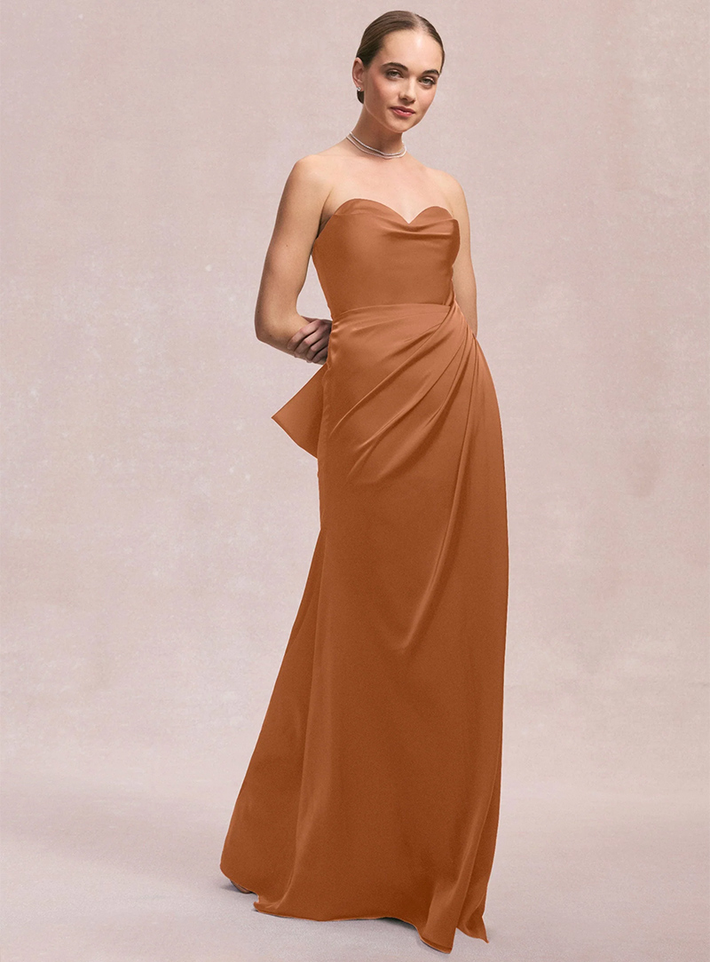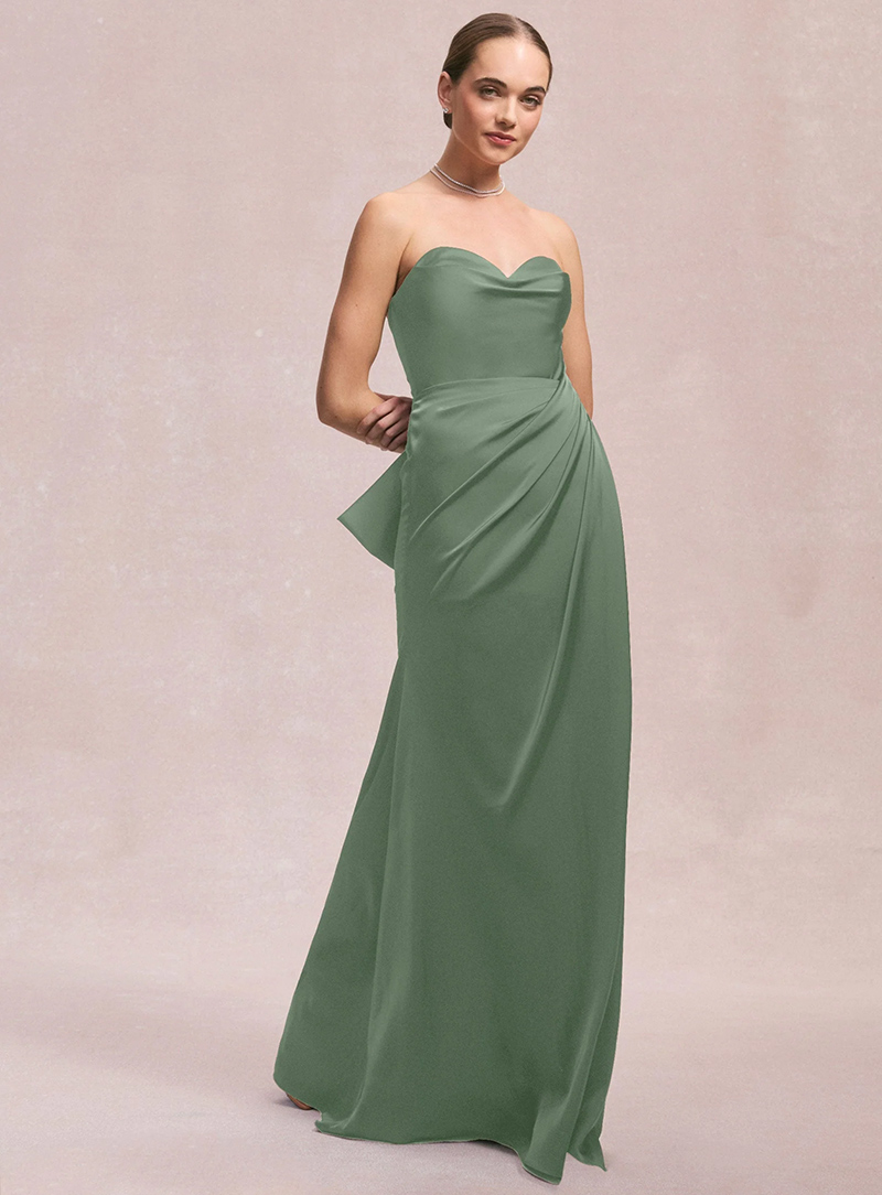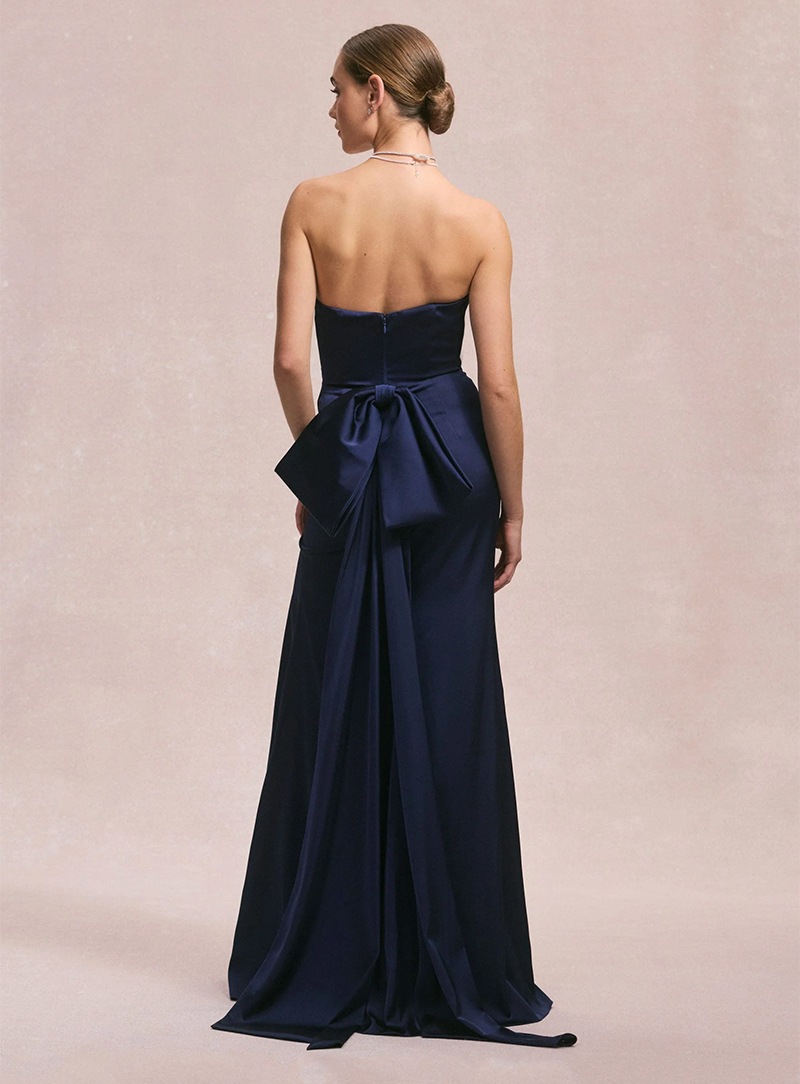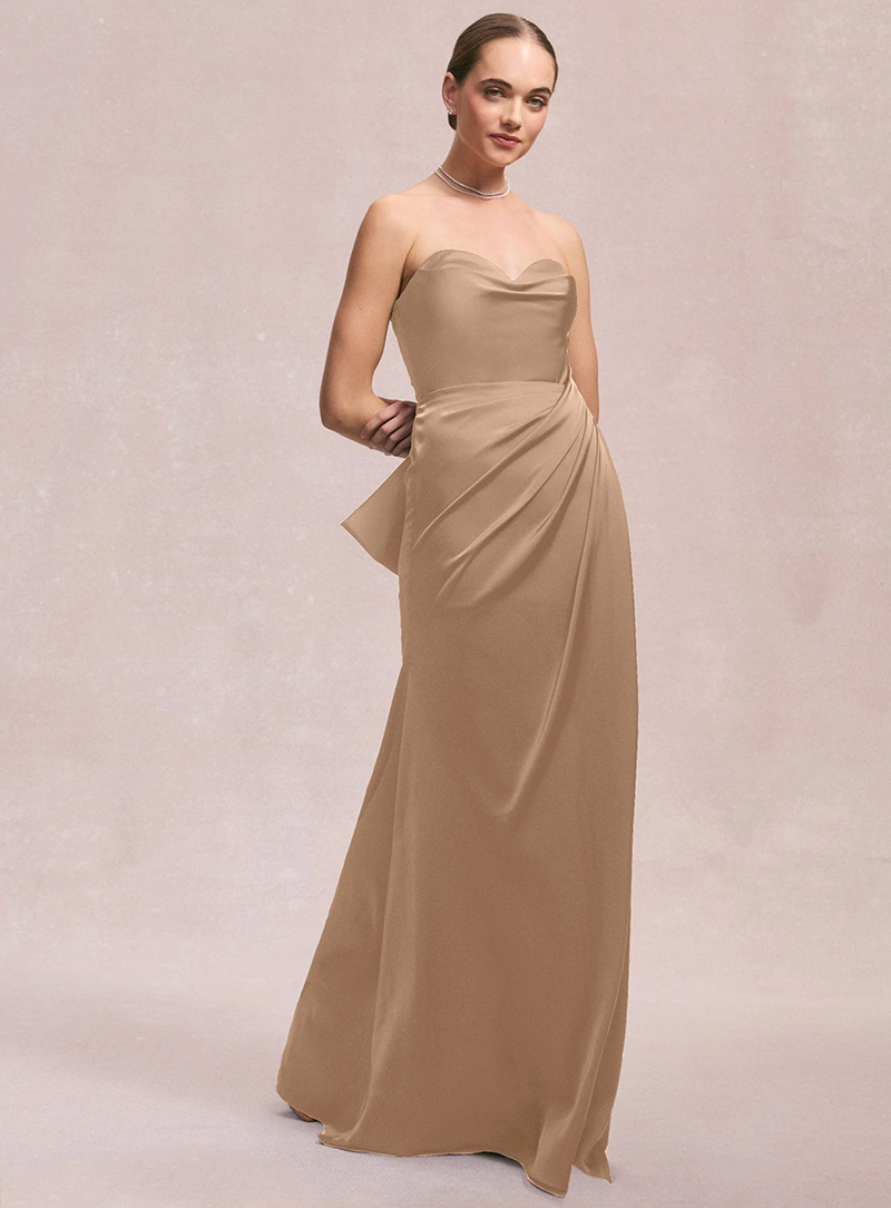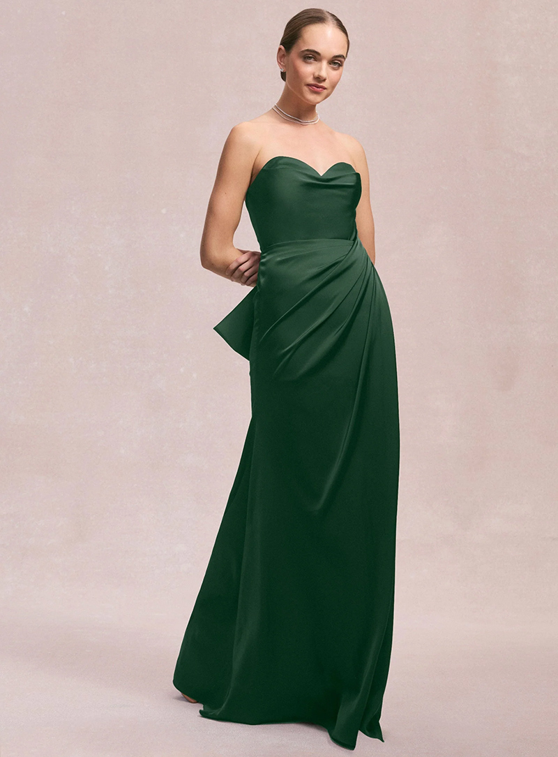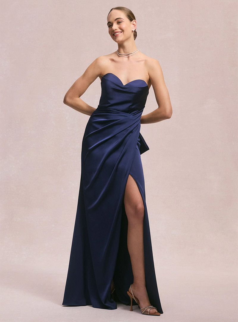 L'abito da sera mozzafiato stupisce con una silhouette semplice e svasata con scollatura senza spalline e un drappeggio glamour impreziosito da una splendida spilla di cristallo. Per un look elegante e moderno, indossa l'abito in raso Larissa. Se preferisci qualcosa di più classico e strutturato.