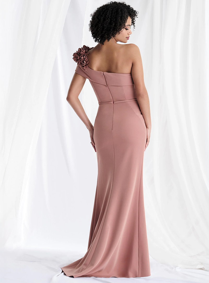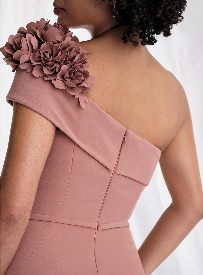 Questo abito da sera svasato in crêpe sfoggia una silhouette monospalla impreziosita da delicate applicazioni floreali 3D. Cuciture stilizzate scolpiscono la figura, mentre un elegante spacco e la cintura coordinata completano il look con naturale raffinatezza.