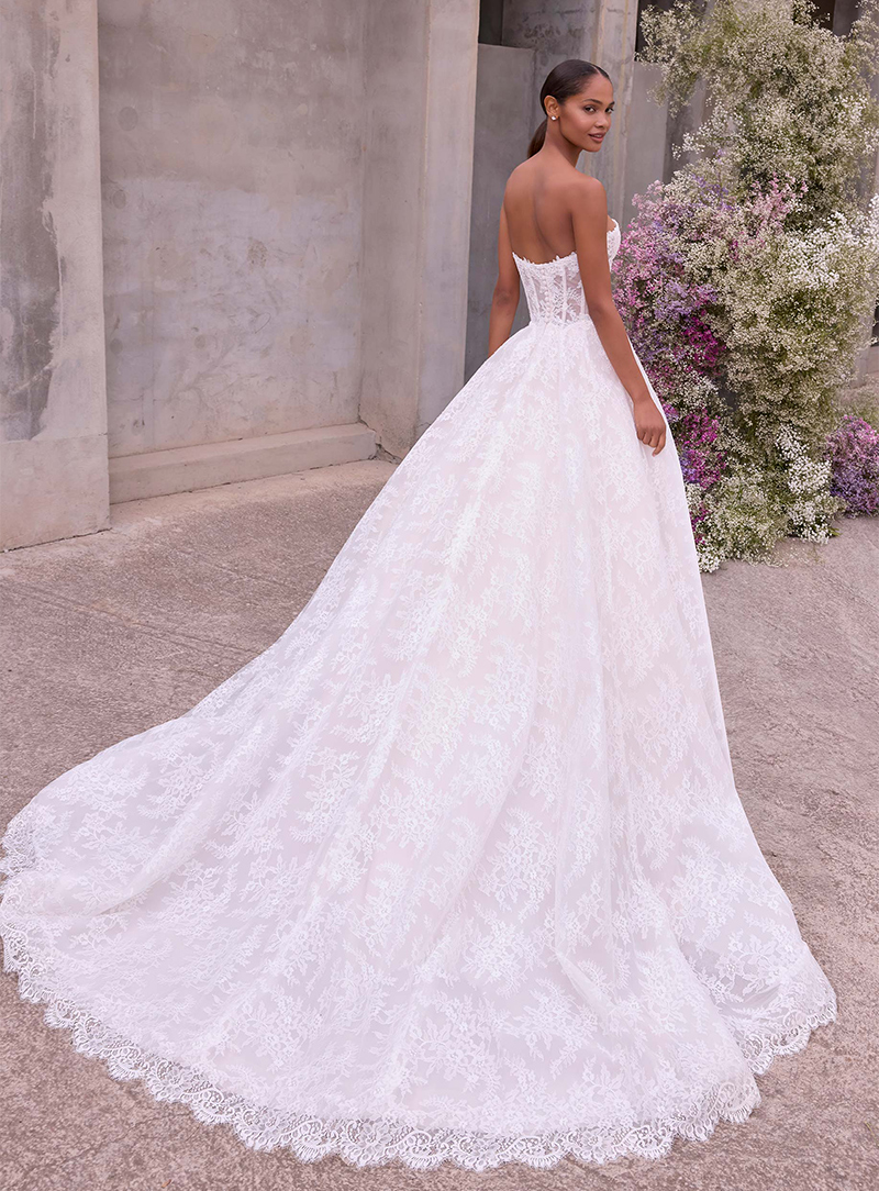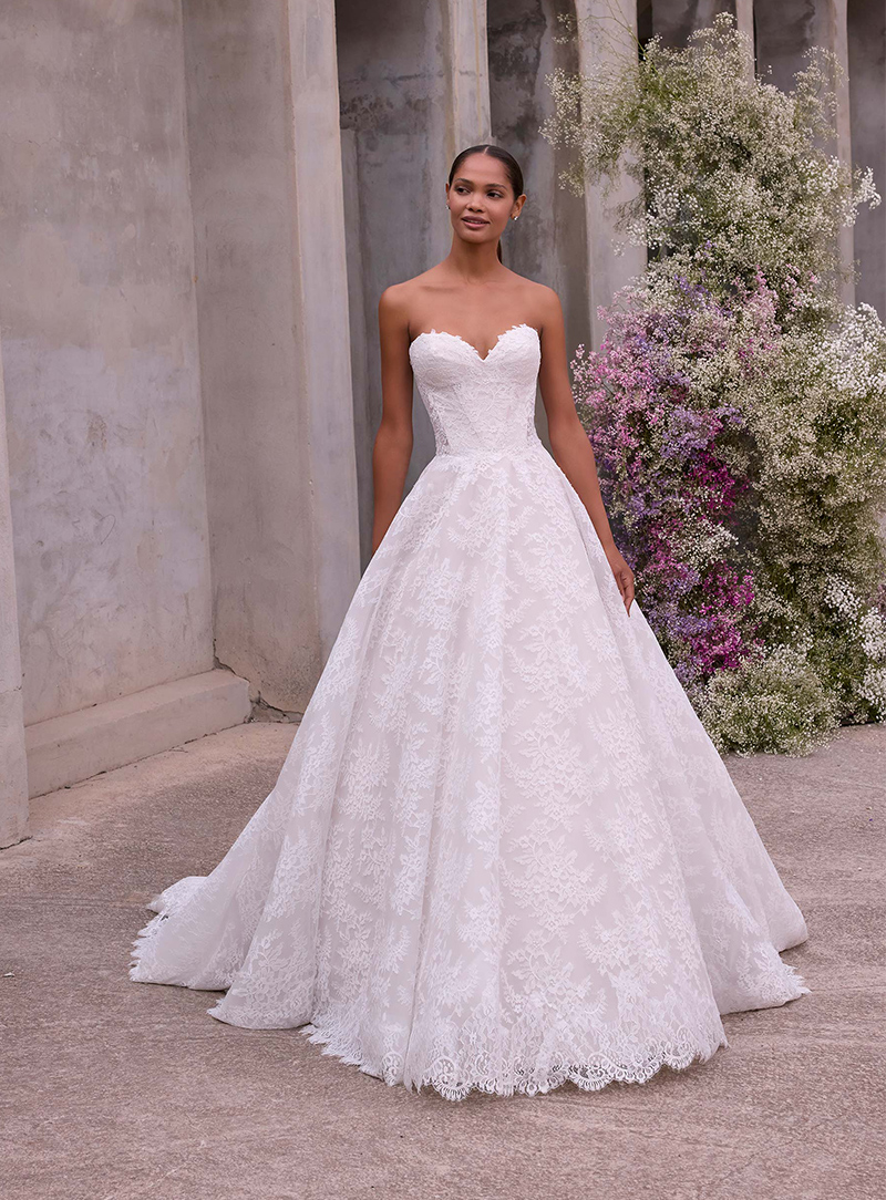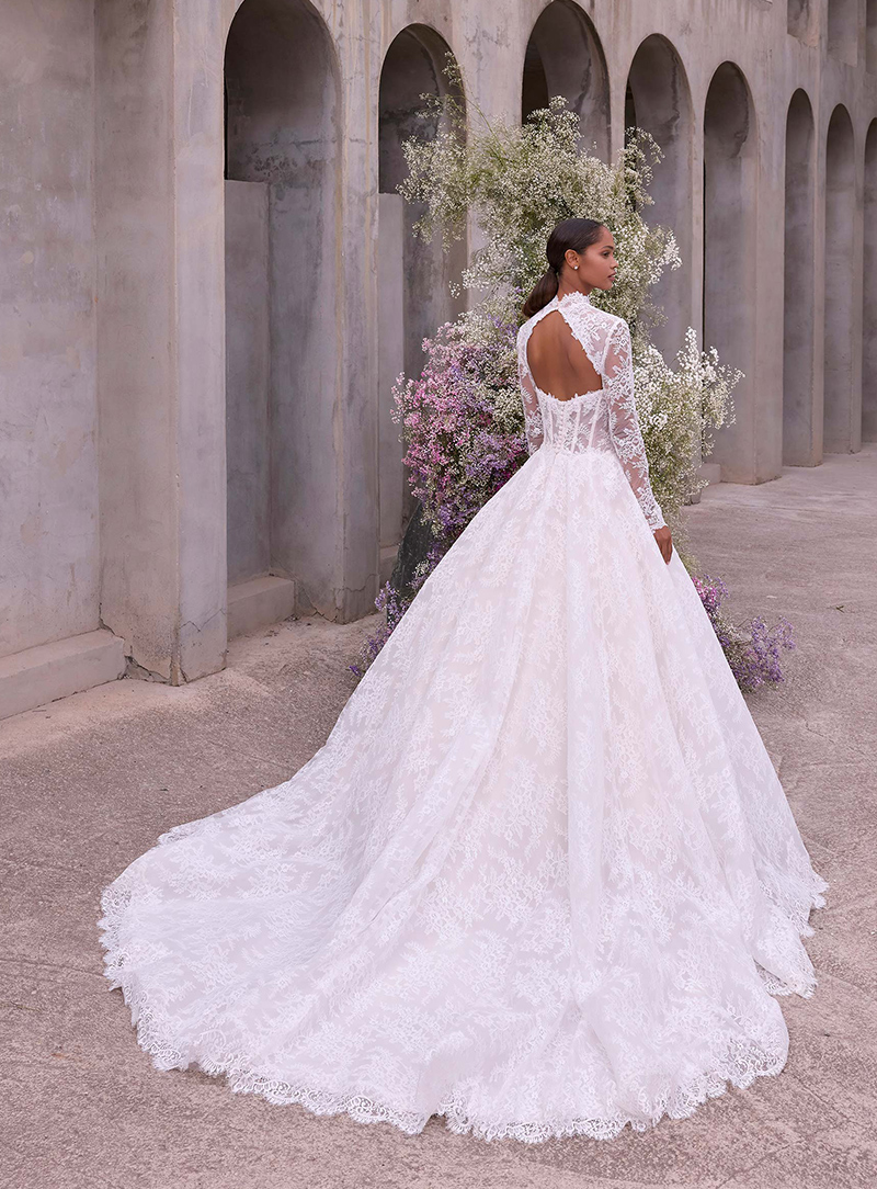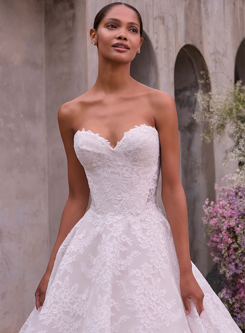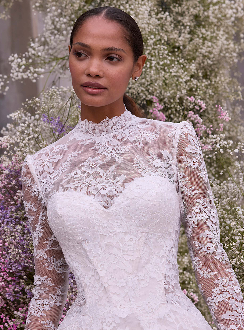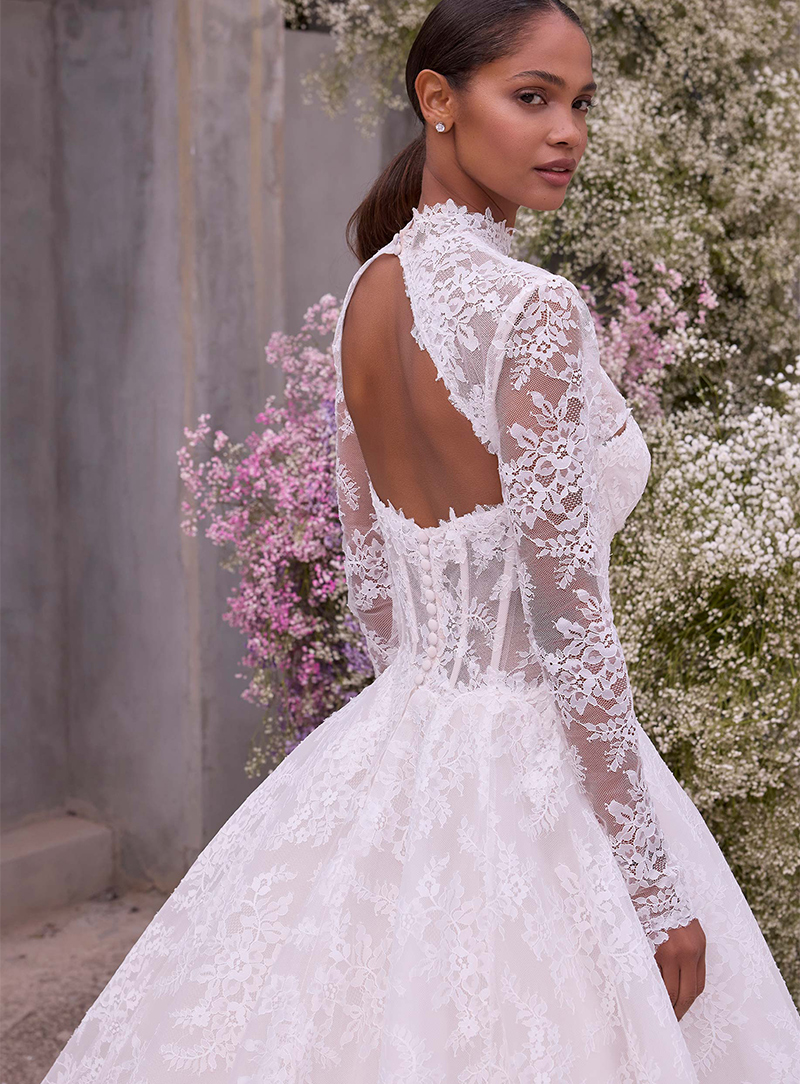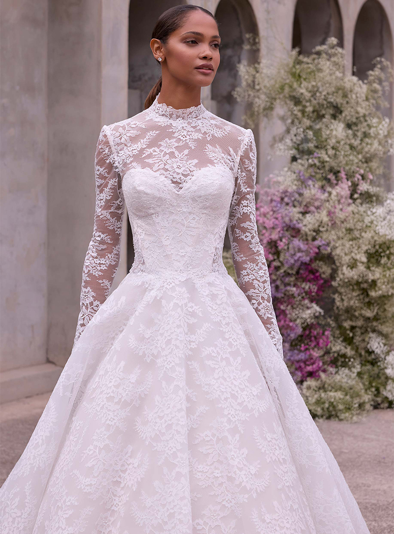 L’abito da sposa con gonna ampia in pizzo Chantilly presenta una scollatura a cuore senza spalline con collo alto, maniche lunghe in pizzo inserite su un corpetto che valorizza la silhouette e  schiena con apertura a goccia.