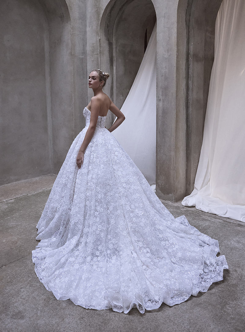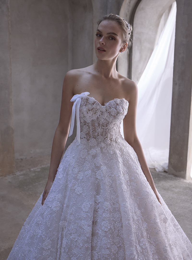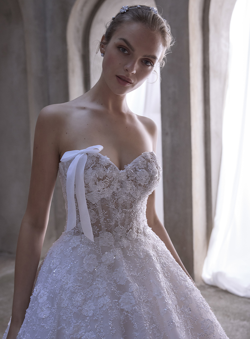 Il nostro abito da sposa affascina con una scollatura a cuore incorniciata da stecche strutturate che scolpiscono la silhouette. Decorato con motivi floreali impreziositi da paillettes e delicatamente ricamati su pizzo Chantilly, il modello fonde un’arte intricata con un’eleganza moderna. Un fiocco in raso staccabile aggiunge un raffinato tocco di versatilità, completando un look al tempo stesso incantevole e femminile.