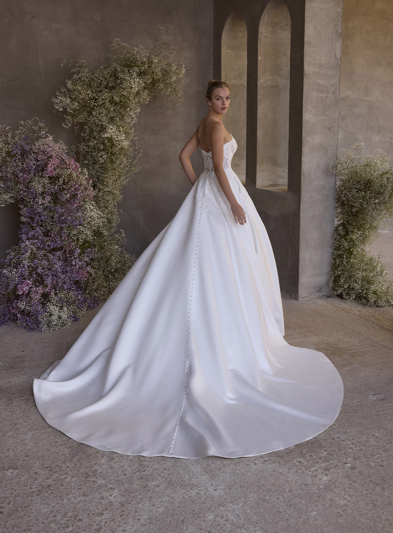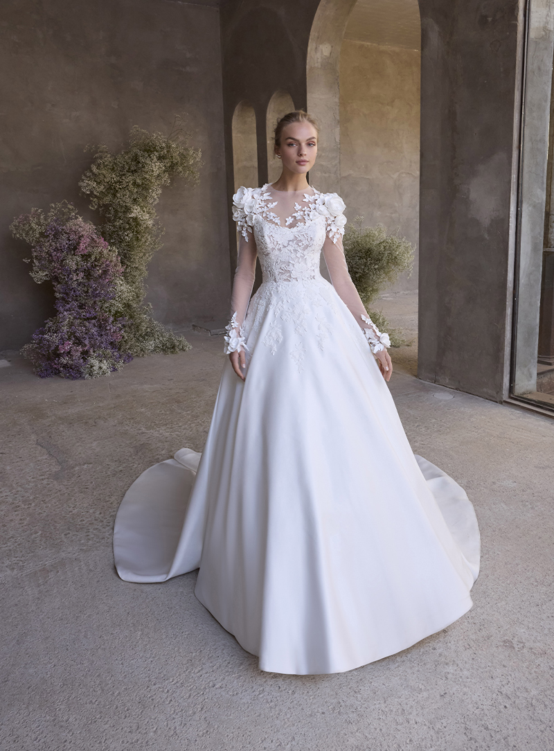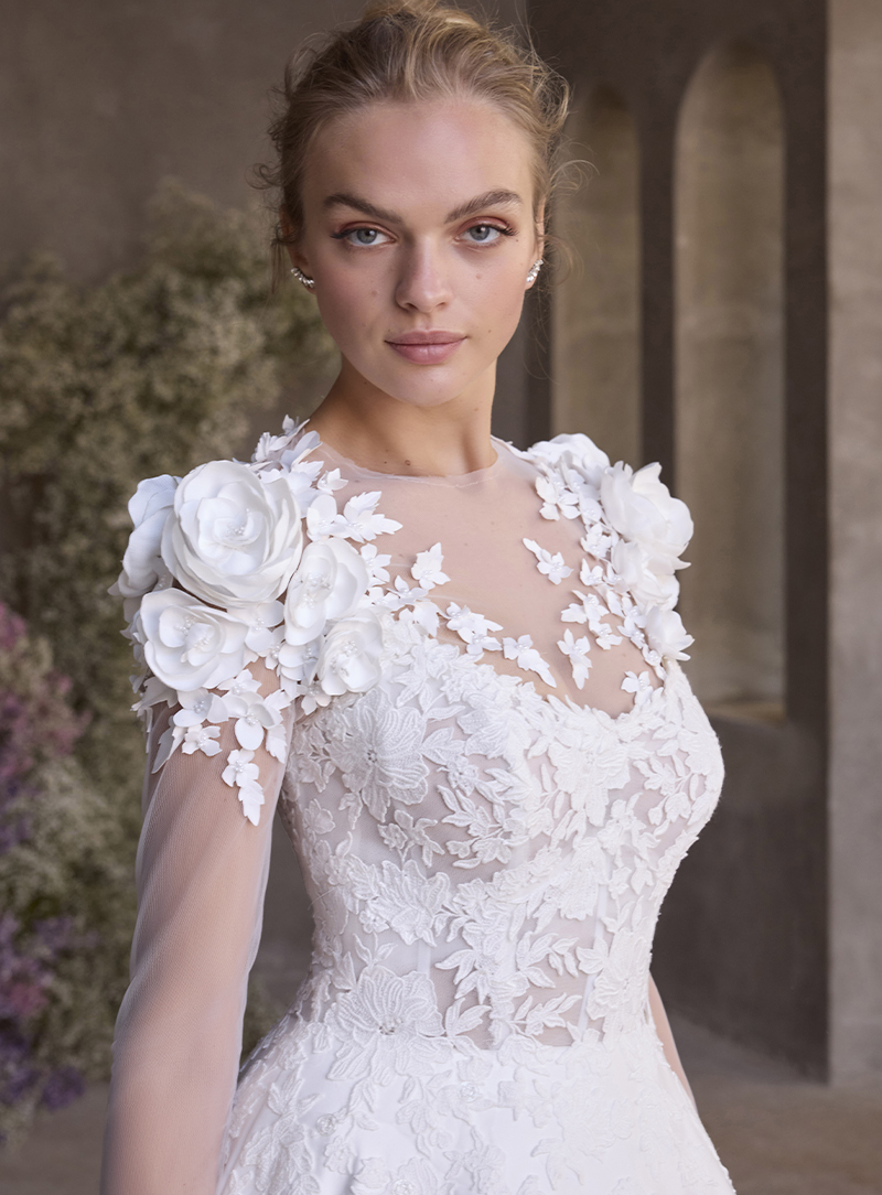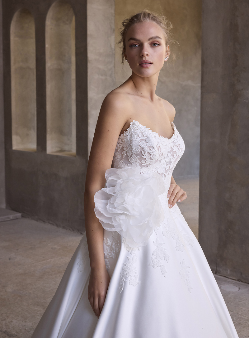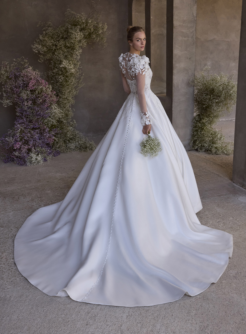 L’abito presenta una scollatura a sbuffo stilizzata a occhi di gatto, su un corpetto in pizzo che fonde struttura e morbidezza. Inoltre, l’abito è arricchito da delle applicazioni in pizzo che si susseguono sulla gonna a ruota in raso, mentre un fiore 3D staccabile aggiunge un tocco di scenografia. L’abito può essere ancor di più arricchito con un coprispalle con maniche a dettagli floreali.