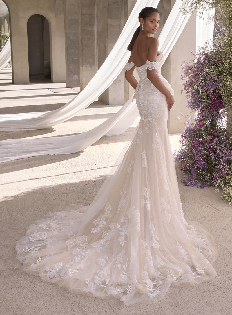 Sinuosa sirena in morbido crepe con inserti in pizzo ricamato presenti sui fianchi e sulle spalline, che legano così una delicata scollatura a V, mentre sul retro si chiudono formando una scollatura in trasparenza. La coda è lunga e realizzata in prezioso pizzo ricamato estremamente luminoso.
