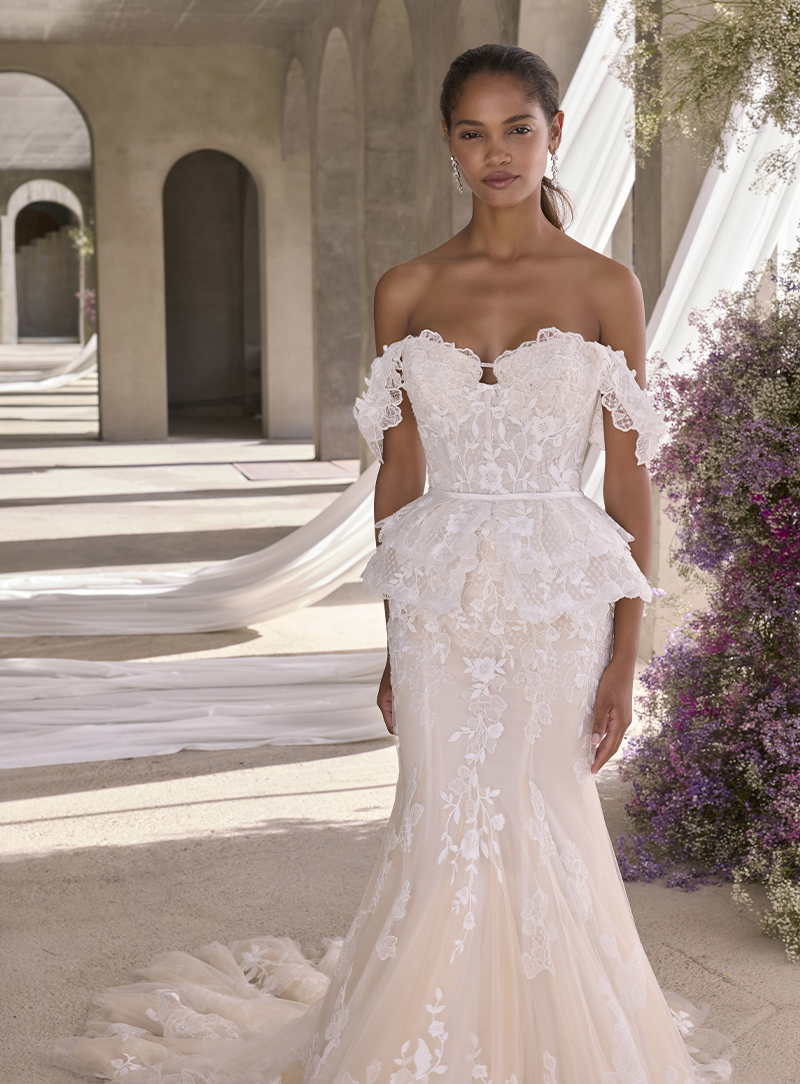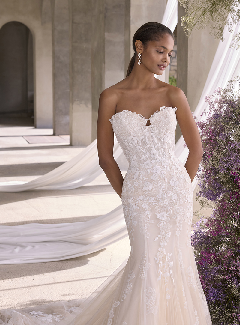 Un abito da sposa da sogno, presenta un corpetto bustier couture con un dettaglio drappeggiato. Lo scollo a cuore a forma di petalo è un tocco romantico con applicazioni smerigliate e ricamate che scendono a cascata lungo la linea a sirena.