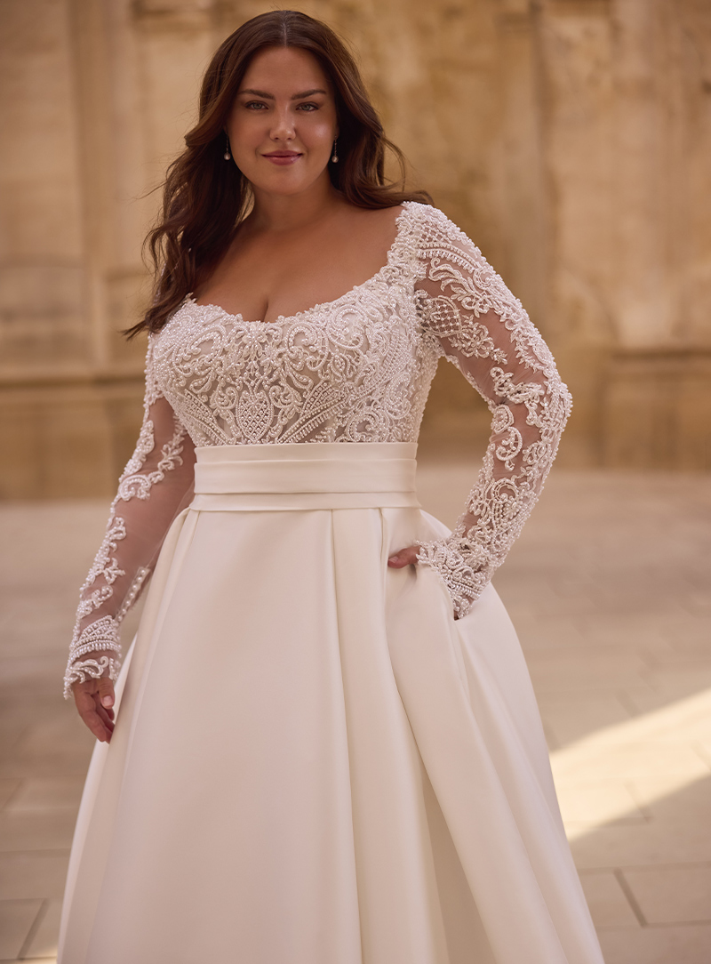 Abito da sposa principessa scollo senza spalline in mikado e pizzo. Questo abito da sposa è realizzato interamente in tessuto mikado che garantisce struttura. Il corpetto aderente è impreziosito da dettagli in pizzo e perline che si estendono alla vita e alla parte superiore della voluminosa gonna da principessa, completata da pratiche tasche per un tocco contemporaneo.