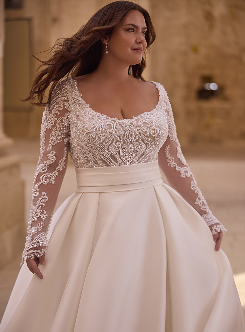 Un intramontabile abito da sposa con gonna a palloncino caratterizzato da un’ampia scollatura quadrata e da un corpetto in pizzo e perline.