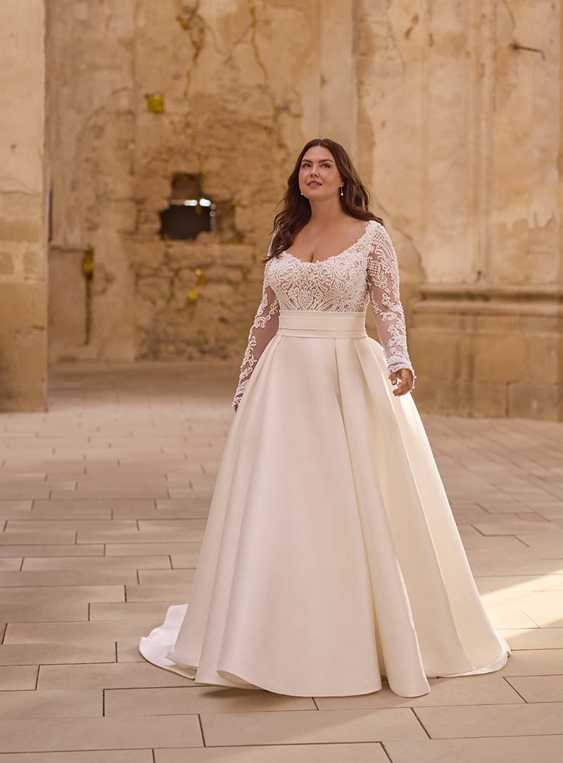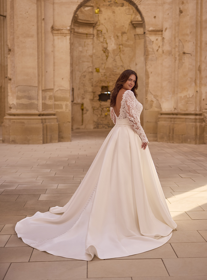 Abito da sposa principessa con scollatura rotonda e spalline in mikado. Questo abito sembra uscito da una fiaba, è un modello dal taglio principesco e interamente realizzato in mikado Kelly, presenta un'elegante scollatura arrotondata sul davanti e sulla schiena, spalline sottili e dettagli in pizzo con perline che si estendono sul corpetto e sulla parte superiore della gonna voluminosa. Infine, sono presenti anche pratiche tasche per un tocco contemporaneo.