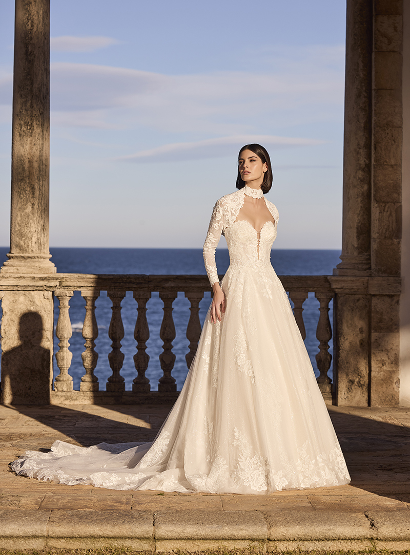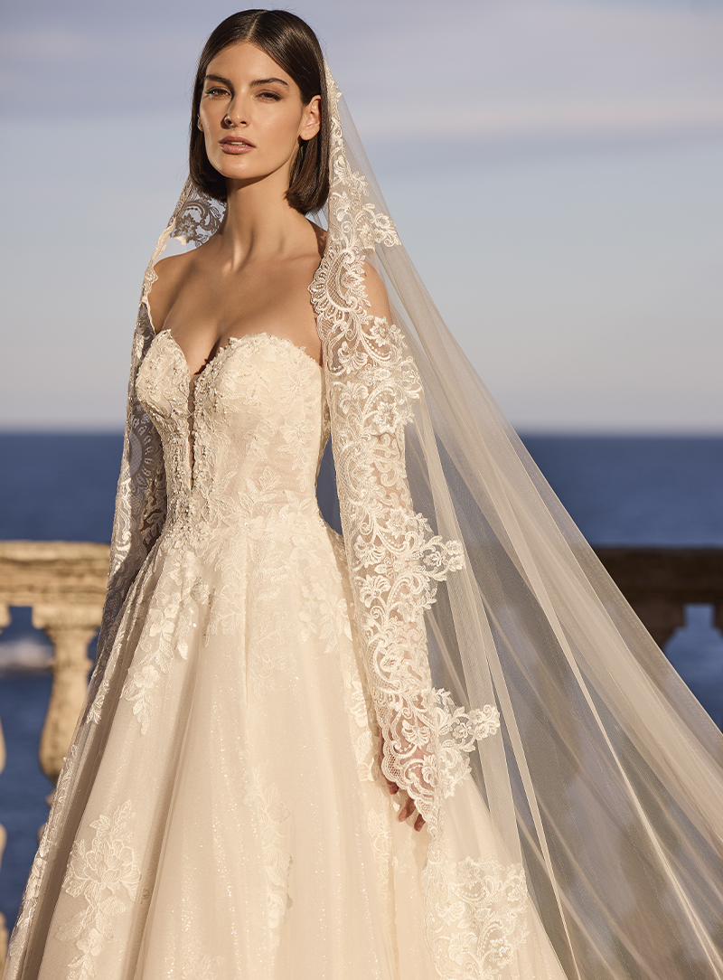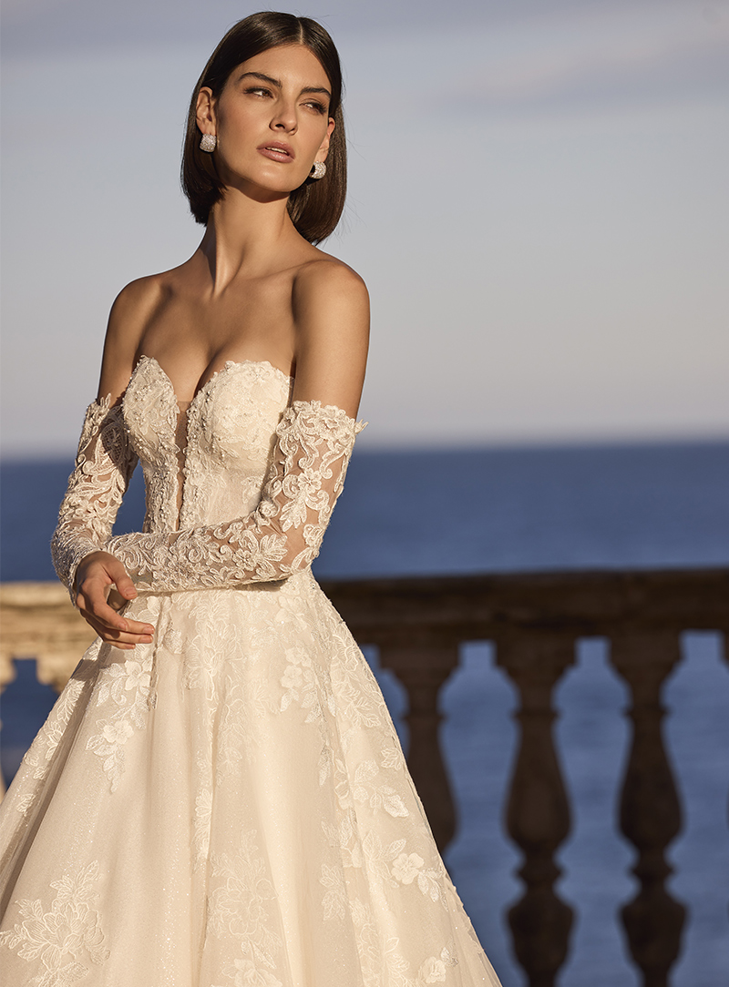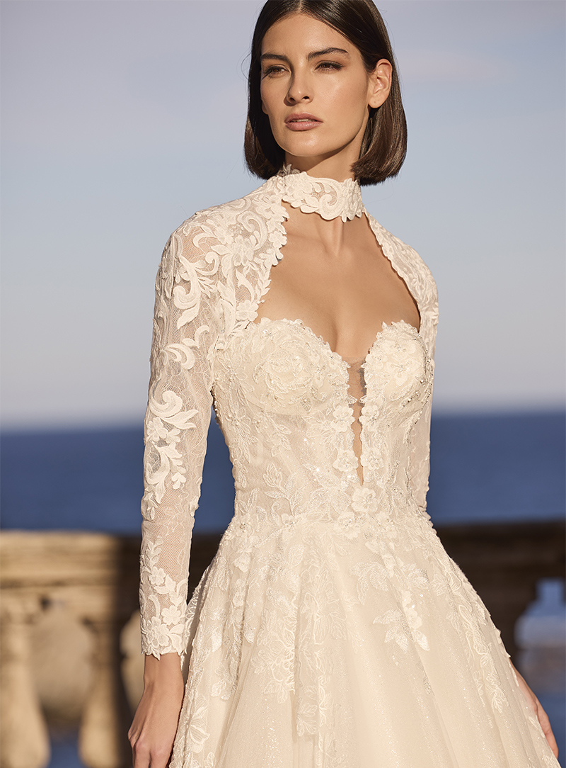 Abito da sposa a principessa con un corpetto decorato da fiori e foglie, con una scollatura a cuore, senza spalline ma con la presenza di maniche in pizzo. La gonna è molto ampia e forma un lungo strascico. Abbinato troverete un coprispalle in pizzo con motivi floreali sulle spalle e sul collo.