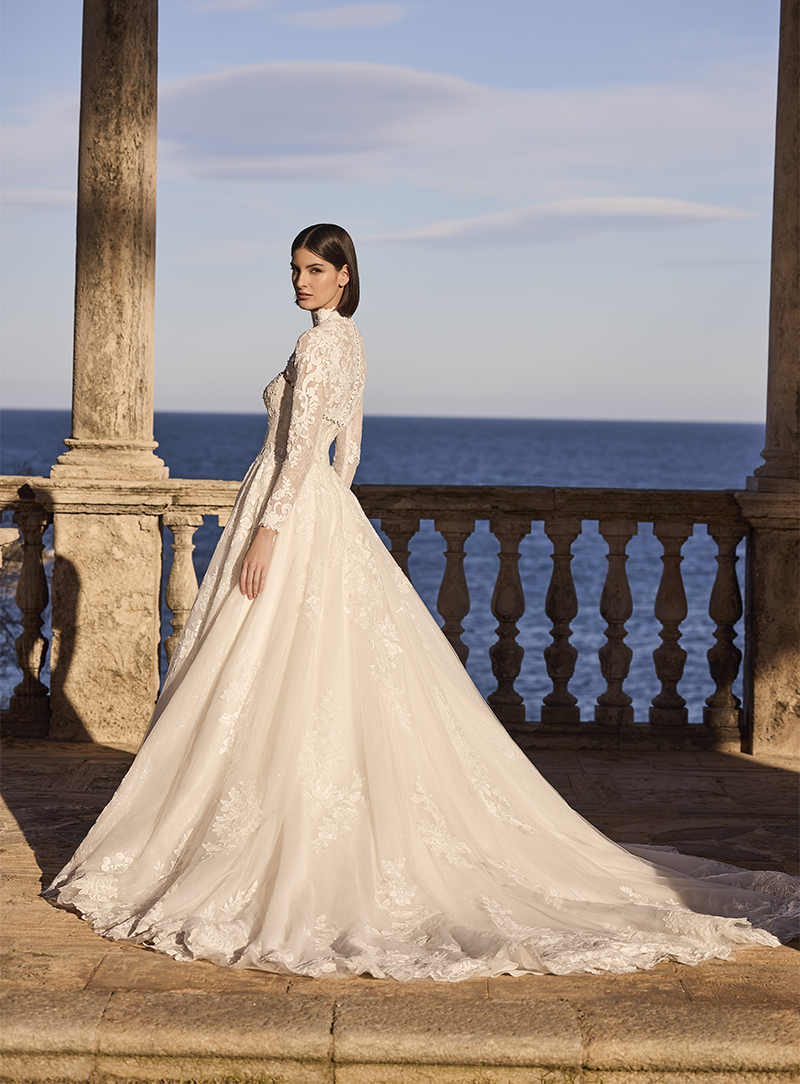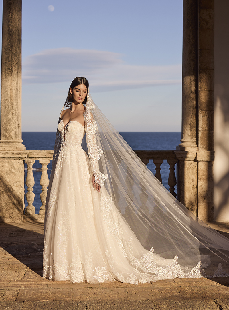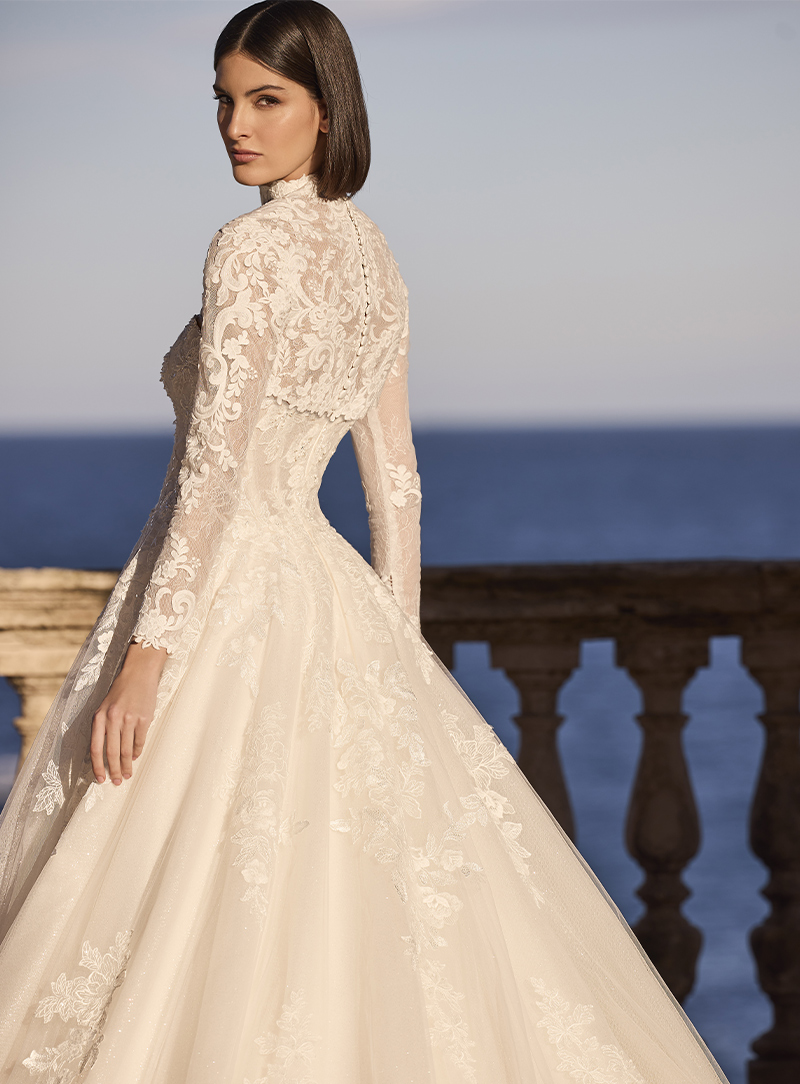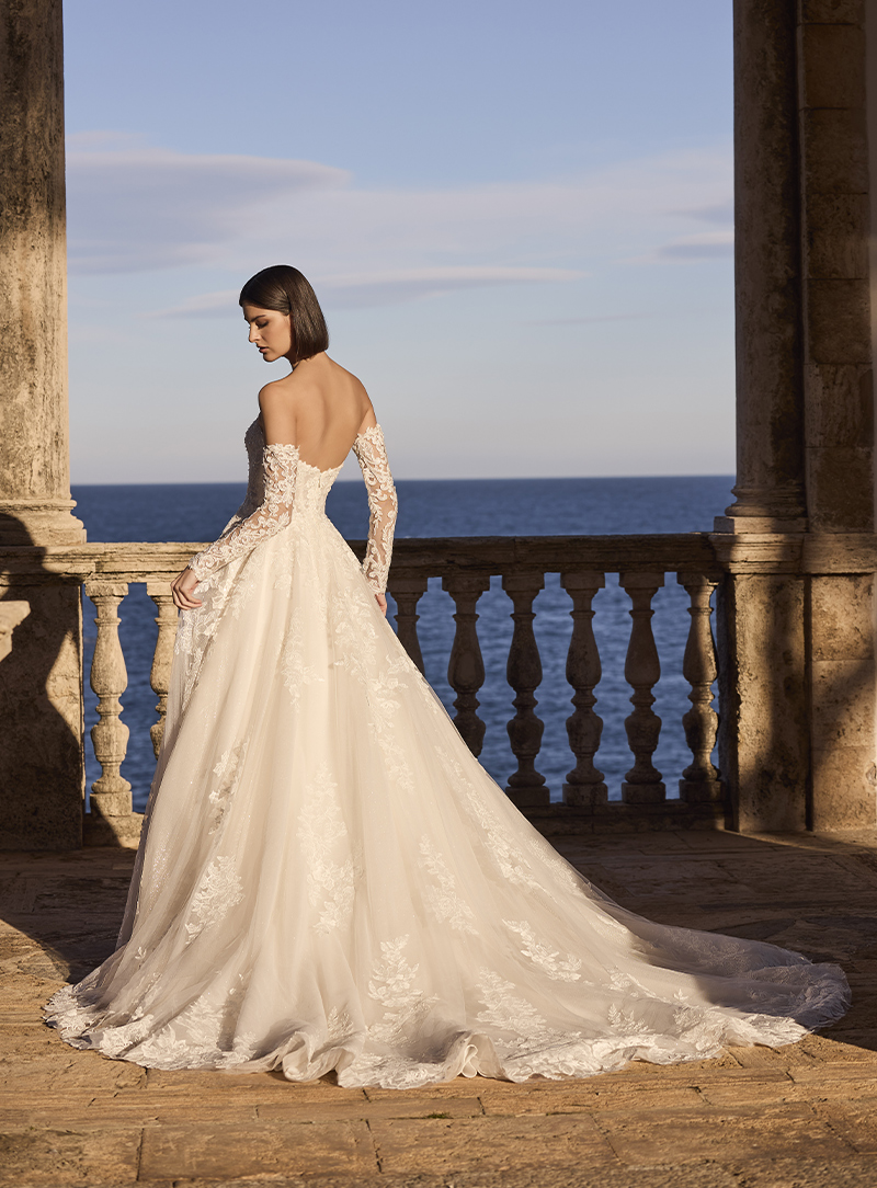 Abito da sposa a principessa con un corpetto decorato da fiori e foglie, con una scollatura a cuore, senza spalline ma con la presenza di maniche in pizzo. La gonna è molto ampia e forma un lungo strascico. Abbinato troverete un coprispalle in pizzo con motivi floreali sulle spalle e sul collo.