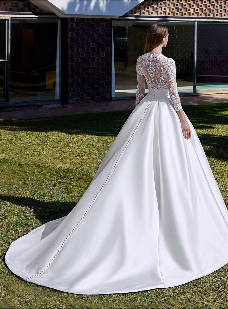 Abito da sposa dalla linea ad A realizzato in mikado con corpino effetto tattoo con spalline e collo alto.