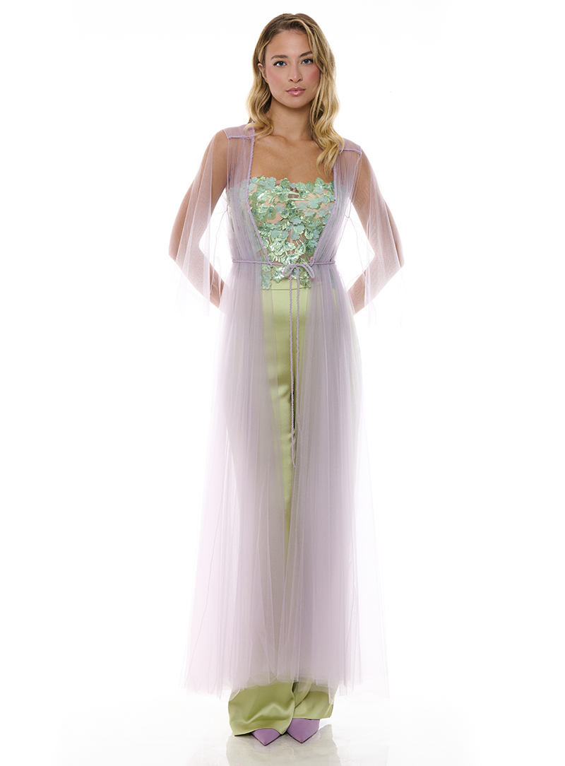 Completo da cerimonia composto da un corpetto in pizzo con effetto vedo non vedo e un pantalone in raso sui toni del verde che scende morbido e valorizza la figura. A completare il look un kimono in chiffon sui toni del lilla da allacciare in vita.